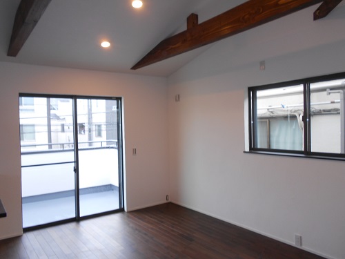 勾配天井に無垢の梁がアクセントになっていて、開放的ですが落ち着いた空間に仕上がっています。