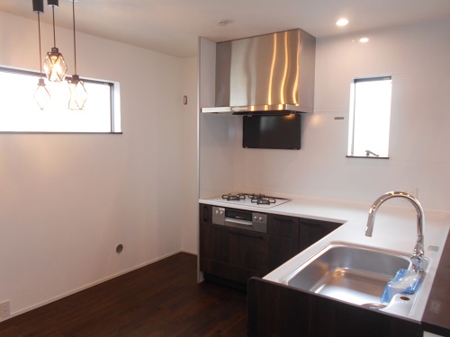 リビングを正面に、対面式L型キッチンを採用しています。