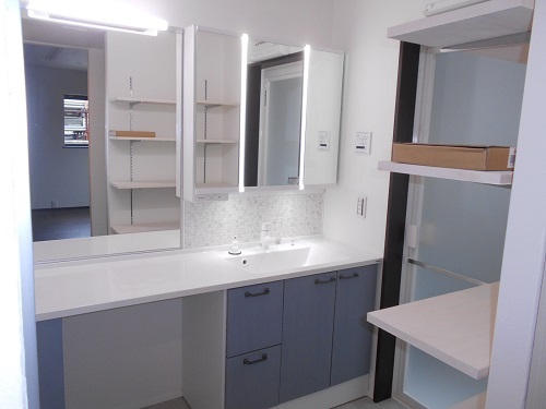 朝の身支度で時間が重なるケースが多く、広めのカウンターの洗面化粧台を採用。