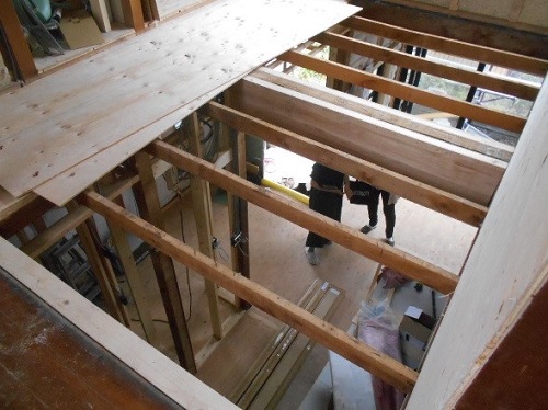 天井下地の終わった2階より床フローリングを貼っていきます。