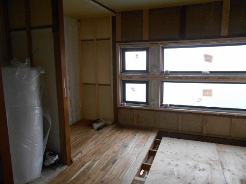 フローリングを貼り終った所から天井ボード・壁ボードと下地を貼っていきます。