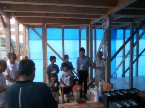 家屋の守護神と大工の神を祀って、棟上げを無事に終えられたことに感謝するとともに最後まで工事の安全を祈る儀式を行いました。