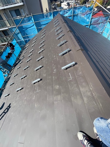 太陽光パネル下にはパネルを取付ける架台を設置しますが、屋根を傷つけないよう、つなぎ目に挟み込む特殊な金具で施工しています。