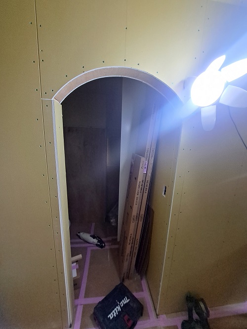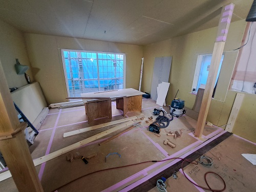 無垢の床材の施工も完了し、壁や天井の下地材、石膏ボードを貼り始めました。
