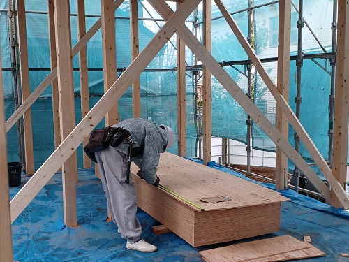 現場へは予め加工済の材料が搬入される他、現場に合わせて大工さんが加工し、全体の組み立てを完了していきます。