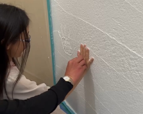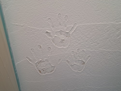 左官屋さんの計らいで、ご家族の手形を壁に押しました。