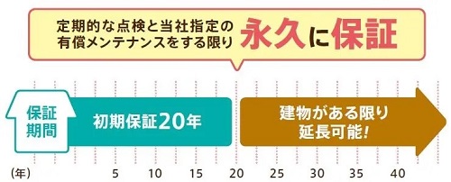 建物がある限り、アイ.創建指定の点検・メンテナンスを実施していただくことを条件に、主要構造部と防水部分を永久に保証します。