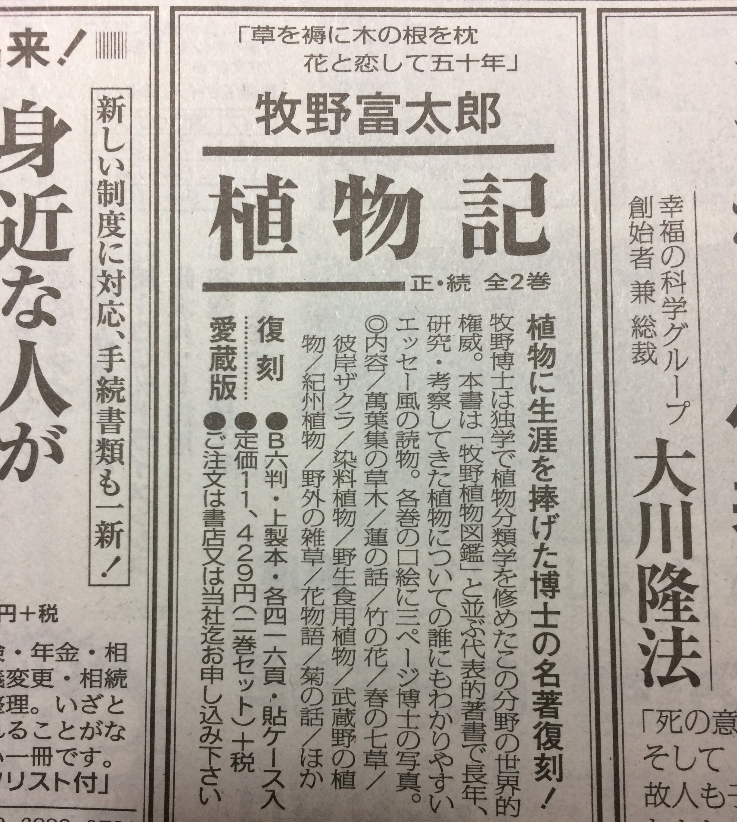 さてさて、それからまだまだどうも気になる私は図書館で「春の七草」に関する本ないかな~って、いろんな棚(栄養学の棚、野草の棚、伝統食の棚、おしゃれ雑誌の棚、子ども料理の棚…)を物色しまくったのですが、どうもしっくりこず、他にもっといいネタないのか?と、消化不良気味で帰宅しました。そして次の日、何気に見た朝刊一面3段広告(書籍)に『牧野富太郎植物記 ◎内容……春の七草/……』とあるではないですか!早速図書館に行きました。
