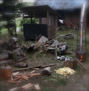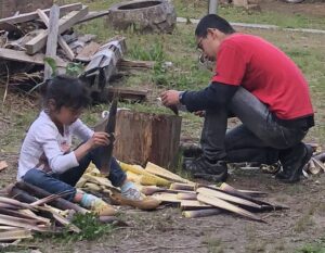 下茹でのために、薪を割り火を炊く。