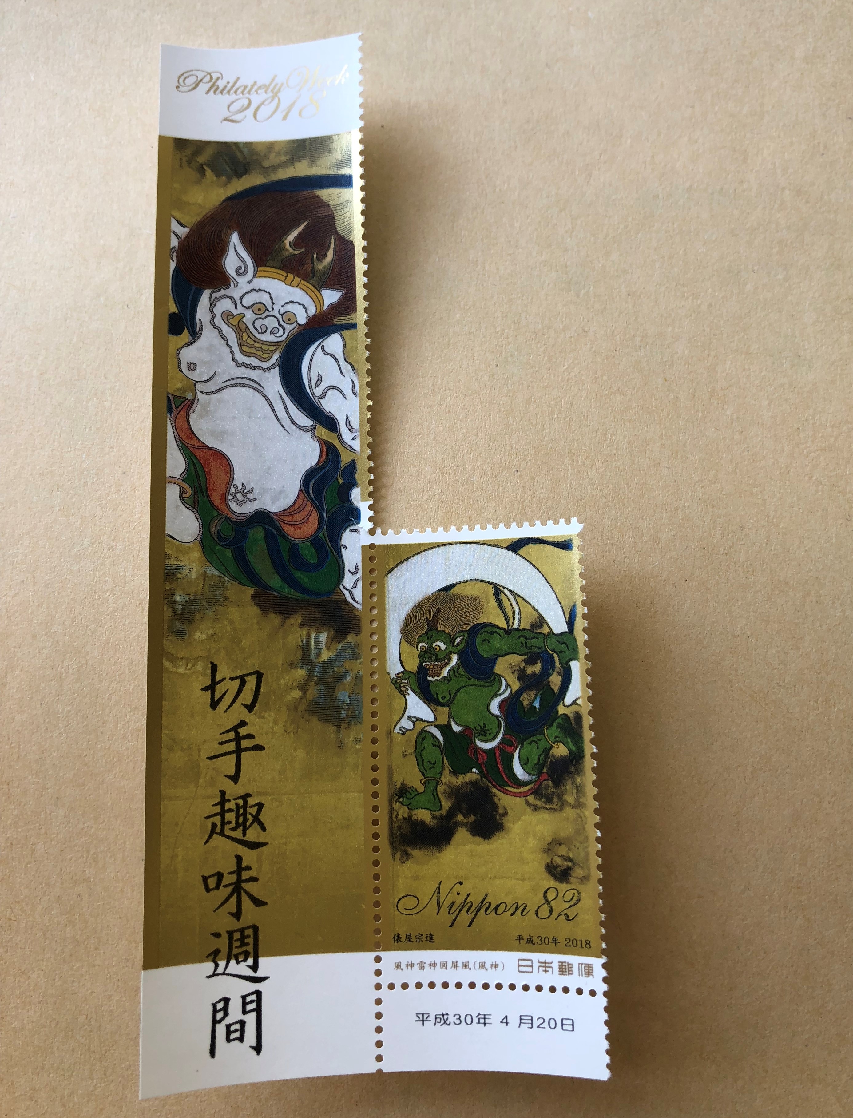 建仁寺所蔵ですが本物は京都国立博物館に寄託。建仁寺では本物そっくりな高精細複製作品の屏風画が展示されています。私もこの躍動感、疾風感が大好きで、いつかは本物にあいたいと切に願っています。今年の4月の切手趣味週間では、なんとこの「風神雷神図屛風」切手が発売されたのですが、うかうかしていましたら市内の郵便局では残っていたのはこの1枚だけ……