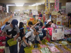自身も被災されたのにバスを提供してくださった方が約30人を瀬戸内市に連れてきてくださいました。まず案内したのが「日本一のだがし屋『大町』」。もともと大町さんは食品やお菓子の卸売業者さんですが、子どもたちでも気兼ねなく買える駄菓子を扱うことは子どもの笑顔が増えることであり、「日本の心を継承する中小零細企業の掘り起こしや共存共栄にもなる」という理念から、日本中の駄菓子をあつめた「日本一のだがし屋」を作られました。