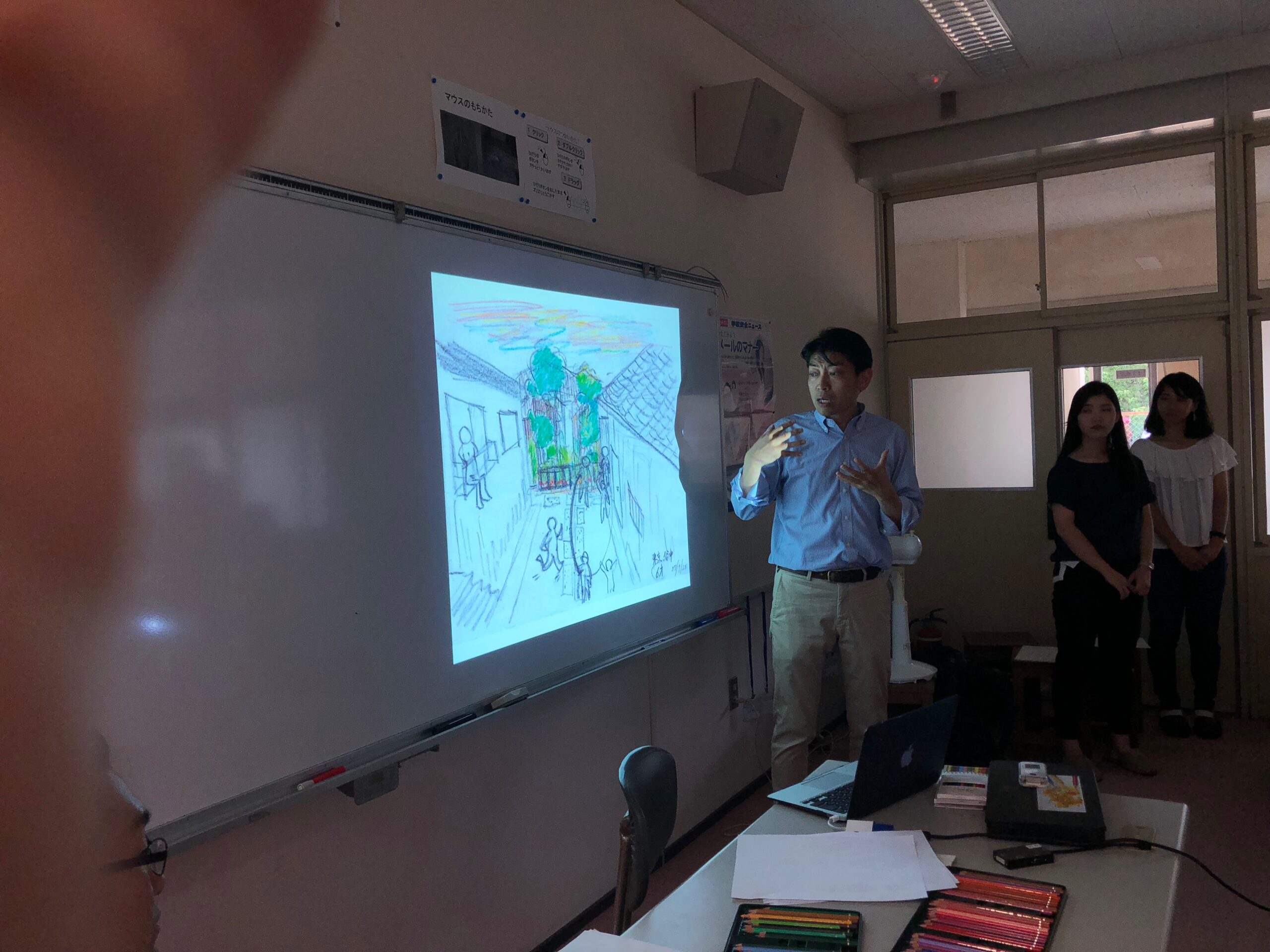 永橋教授は、東京都台東区谷中のご出身。「谷中は、上野にも近く東京下町レトロ感が漂う場所。どこか懐かしい風景を住民はずっと大切にしています。そんな土地で、みんなが楽しそうに暮らしている雰囲気が子どもの頃から好きだったんだなぁ~そんな感覚が今につながっているんだなぁ~と、自分でも絵を描くことによって、ふと気づき、どうしてこのワークショップをするようになったのかとても腑に落ちました。」と永橋教授。そんな話がとても心に響きました。「また来て下さいね」って思わず叫んだ学生も。私も、今度は地域の方々もお招きしたいと思った次第です。