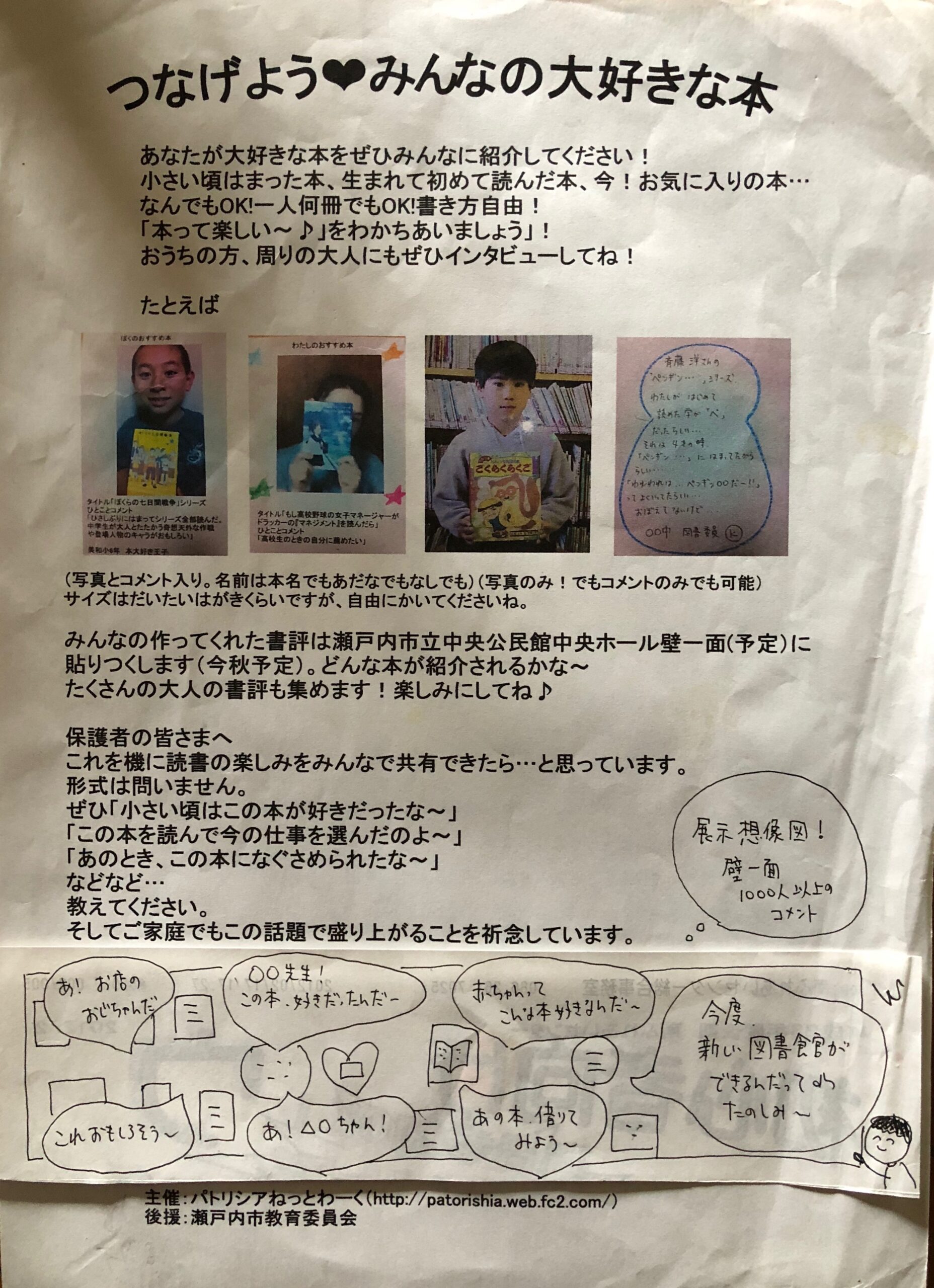 そして、先ずやろうと決まったのが、「わたしのお気に入り本の紹介」を市民参加で広げる仕組みをつくることでした。自分の知らない本を魅力的に紹介するテレビ番組や雑誌って、自分の興味や関心がかきたてられますよね。それを市民参加でやろうと。知人が紹介している場面を見る事もあるでしょう。参加者全員がワクワクでき、人の輪が広がる仕組みにしようと。