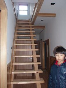 木の質感を活かしたストリップ階段。腰板は杉。