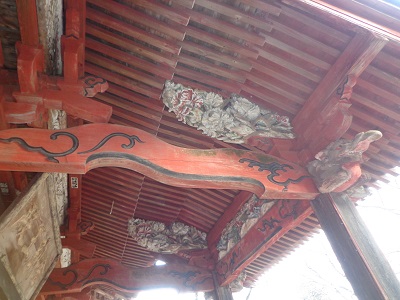 向拝の手挟彫刻の牡丹がとても華やかです。当時の職人さんたちの技術力に圧倒されます。