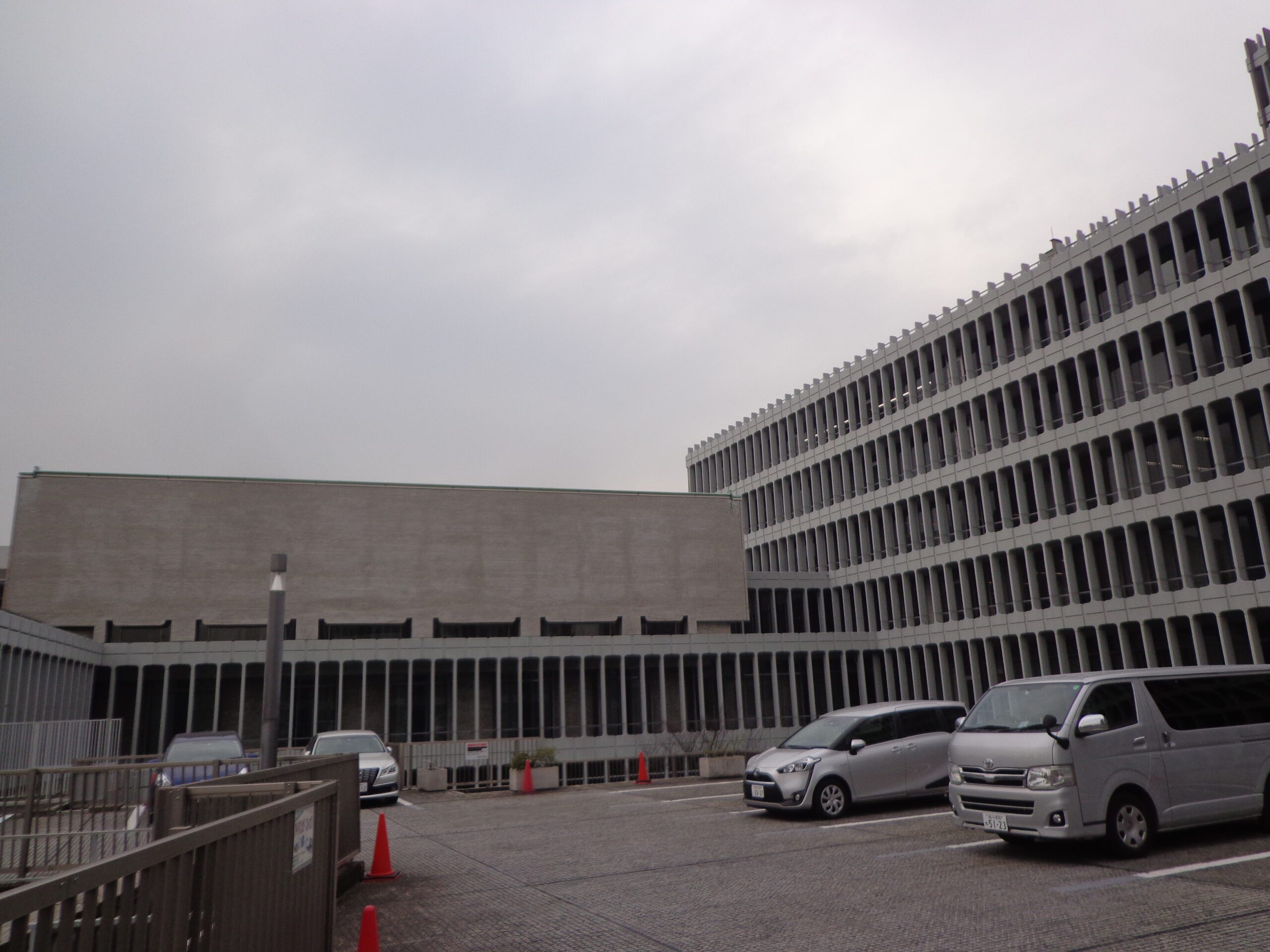 目黒区総合庁舎の駐車スペースは石畳舗装になっており、味気ないアスファルト舗装とは違った、良い味が出ていて、建物との調和が心地よいです。