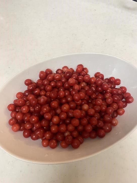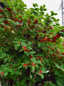 実家の庭に山桜桃梅(ゆすらうめ)が実りました。