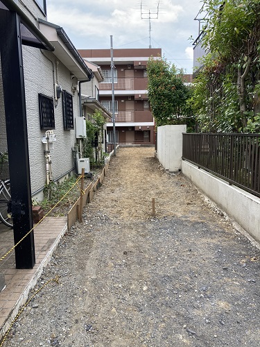 今回のS様邸は難題があります。道路から敷地に入るまでの通路幅が2mほどで、15mほど奥に移動してから敷地に入れる所謂「旗竿地」と呼ばれる敷地形状になります。