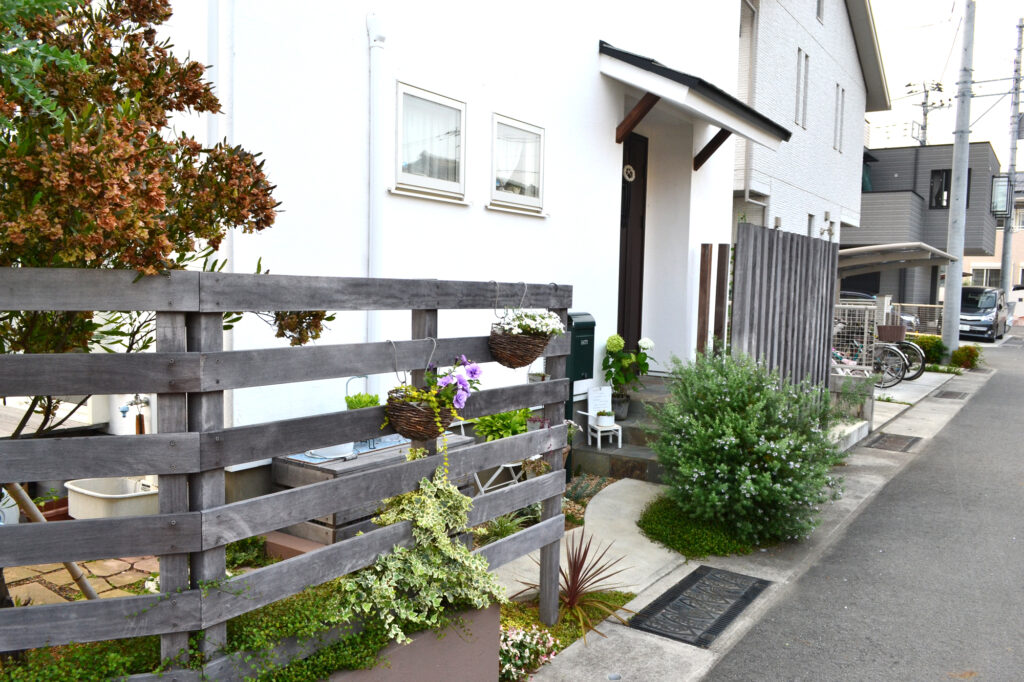 程よく色あせた無塗装の塀と漆喰の外壁が調和している。漆喰の外壁は調湿作用が高いのも特徴。