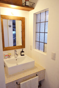 完全オリジナルの洗面化粧台。施主のセンスとアイ創建の丁寧な仕事ぶりがうかがえる。