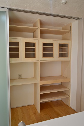 食器棚とパントリー兼用の大容量の収納。お仕事で毎日多忙の奥様に配慮した、造りつけ収納です。