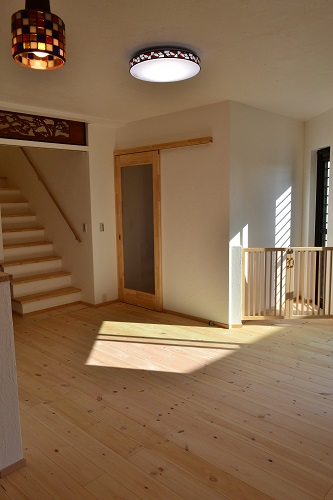 リビングの無垢板が奇麗ですね。時間とともに艶が増して、15年もすれば鏡のように反射します。