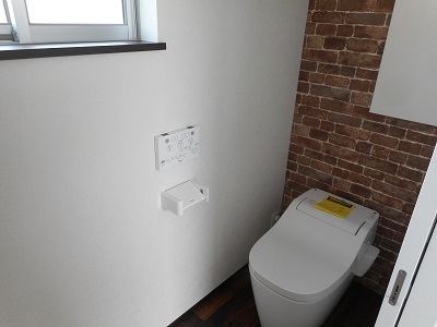 トイレの壁一面にはアクセントウォールが設けられています。タンクレストイレのため、反対面には手洗器が設置されています。