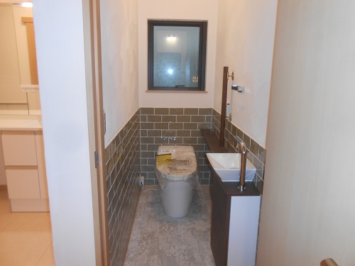 来客兼用の1階トイレ。シックな雰囲気にまとめました。清掃性にも配慮し腰壁には陶器製のタイルを採用しています。