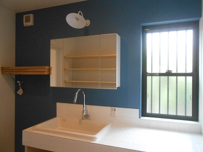 外壁と同じくマリンブルーの壁の洗面室。白い照明も素敵なアクセントになっています。カウンターを広めで機能関。