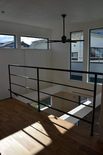 吹抜けに面したスケルトン階段は、Y様の憧れの一つ。今回は木製とアイアン手摺を組み合わせ、