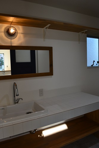 造作の洗面台の広いカウンター。朝の忙しい時間にこそ、その威力を発揮します。