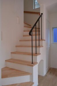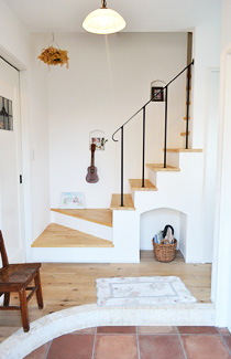 玄関正面の階段。照明器具やニッチ、アイアンの手すりなど、随所にS様の個性が光っていますね。