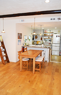 完成5年後の写真。床のナラ材があめ色に艶が増しています。天井の黒い梁は、京町家で使われていた古材を再利用しました。