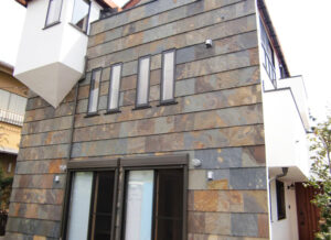 このお住まいは坂の途中にあり、Rを描く石張りの外壁が街のランドマークとなっています。