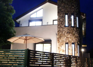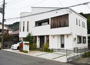 近隣でも目立つ外観のお住まいで、素材の質感が生きていますね。縦長の窓が3つあるリビングの形状が特にユニークです。