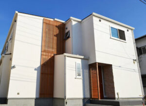 木製格子で縦に大きなラインを取り、外観に個性を与えています。