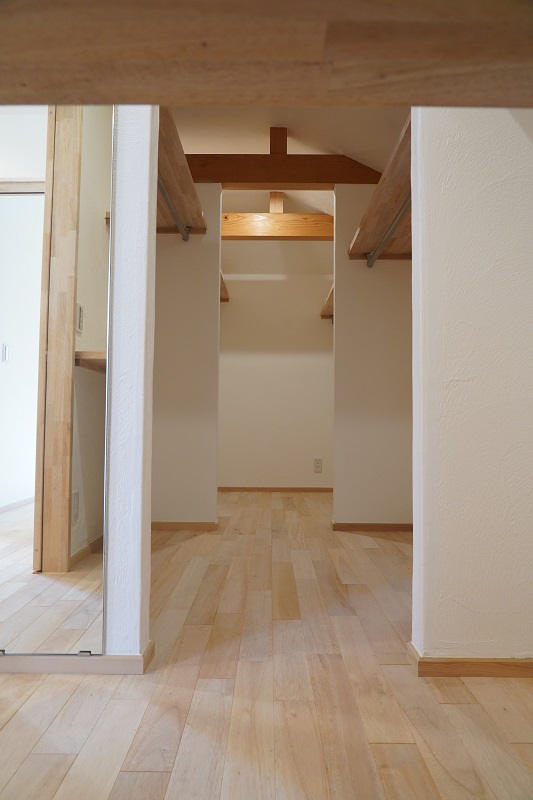 上の写真は、2階にある6帖のファミリークローゼットです。室内物干し場から直結しているため、洗濯にまつわる、「干す」、「たたむ」、「収納する」という一連の行為が全て、集約しています。