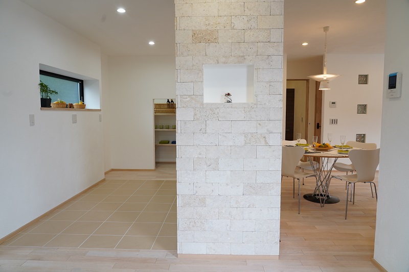 ご家族や来客者をお出迎えするのは、サンゴや貝殻の化石が入った天然石の壁。この壁には印象的なスクエアな造作ニッチを取り付けました。