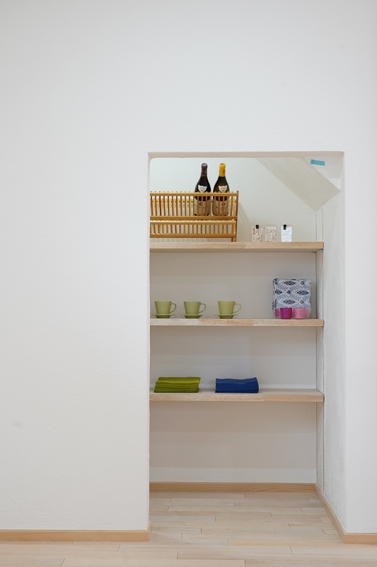 キッチンのすぐ横のパントリー。空間を無駄なく使いこなしたいという奥様からのご要望に従い、階段下を有効活用しています。