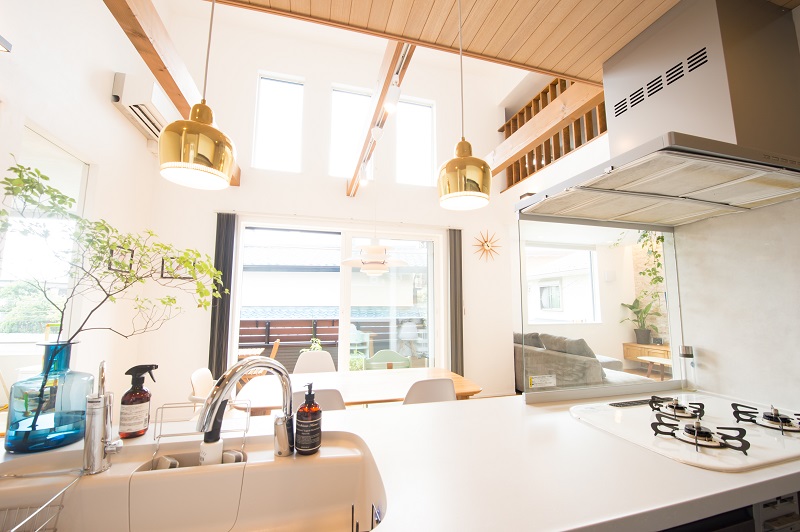 キッチンからはリビングダイニング、チャイルドスペース、アウトドアリビングを