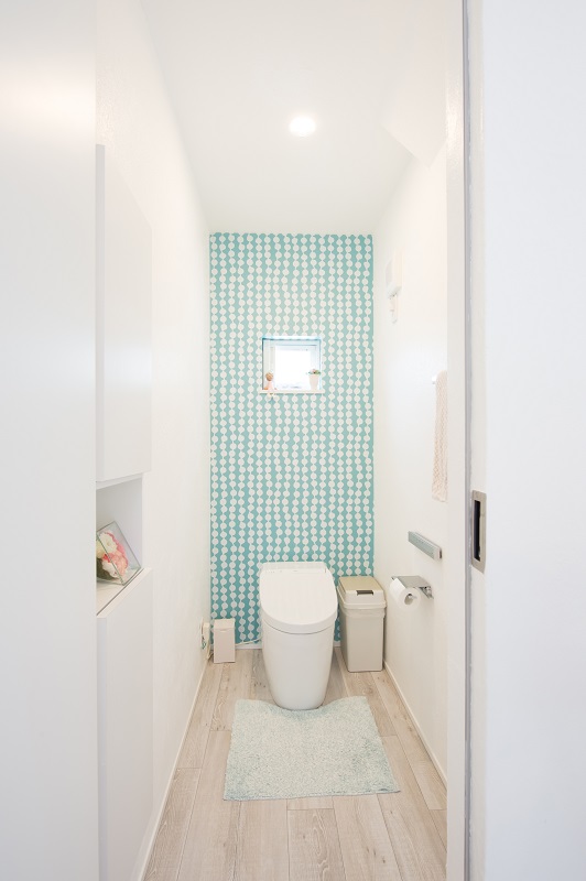 背面のアクセントが印象的な、優しい色合いのトイレスペース。